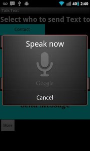 Talk Text requires an Android version of 1.5 or higher for the speech technology to work. But, I tested the Talk Text app with my old Samsung Moment Android cell phone and it worked great!  The app costs $1.99 and it is well worth the money.